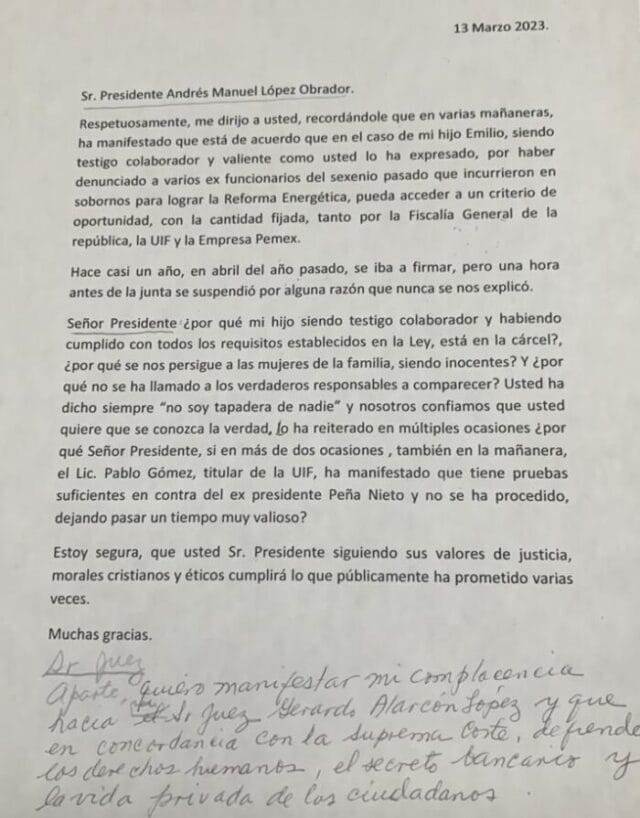 “En varias mañaneras ha manifestado que está de acuerdo que en el caso de mi hijo Emilio, siendo testigo colaborador y valiente como usted lo ha expresado, por haber denunciado a varios ex funcionarios del sexenio pasado que incurrieron en sobornos para lograr la Reforma Energética, pueda acceder a un criterio de oportunidad, con la cantidad fijada, tanto por la Fiscalía General de la república, la UIF y la Empresa Pemex”, expresó.
