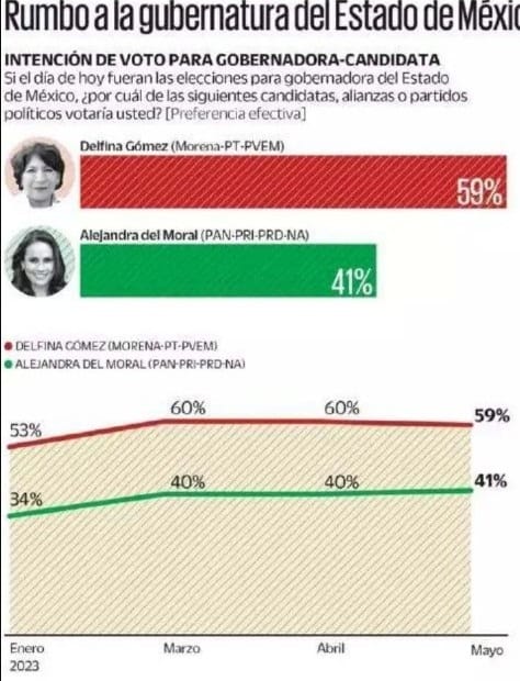 De acuerdo a encuestas de El Financiero y El Universal de este lunes 29 de mayo, la ventaja de Delfina Gómez es de 14 a 20 puntos, las cifras son firmes, al menos que la gente no acuda a votar o aparezcan «casos atípicos» como ocurrió en la elección del 2017.