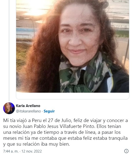 “Mi tía viajó a Perú el 27 de julio, feliz de viajar y conocer a su novio Juan Pablo Jesús Villafuerte Pinto. Ellos tenían una relación ya de tiempo a través de línea. Al pasar los meses mi tía me contaba que estaba feliz, estaba tranquila y que su relación iba muy bien”, relató Karla en ese momento.