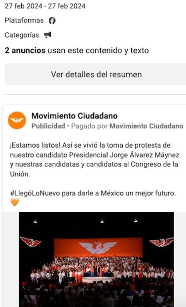 Por debajo de los gastos de Mario Delgado, Movimiento Ciudadano reportó la inversión de 1 millón 701 mil 897 pesos para 810 anuncios. El partido se caracterizo por publicaciones con el hashtag #LoNuevoApenasComienza; y dos de sus anuncios del 27 de febrero para los que el partido pagó de 9 mil a 10 mil pesos muestran la toma de protesta de Álvarez Máynez como candidato presidencial.